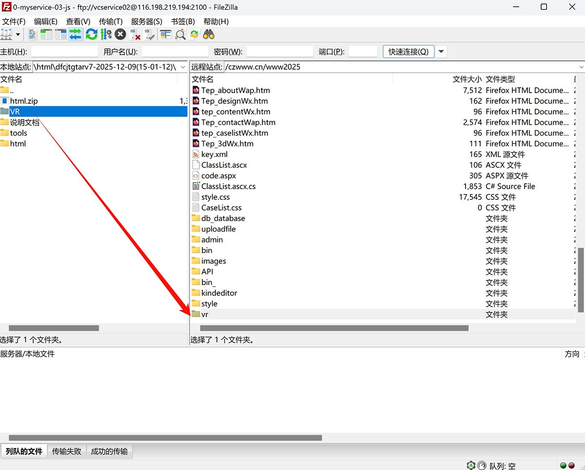 向你服务器所在服务商获得FTP或服务器控制权,通过FTP上传VR目录和所有文件到服务器对应根目录,如下图:
